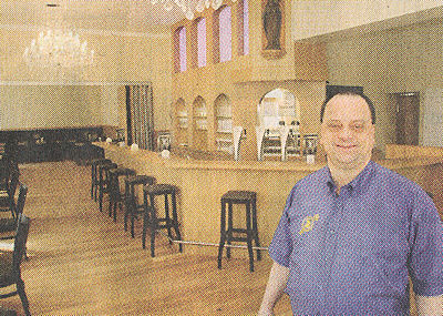 dem freundlichen Holzton der Möbel und des Bodens absolut gelungen. Kleine Farbtupfer, wie die schwarzen Stühle, die dunkle Bepolsterung oder die weißen Lüstern an der Decke runden das anschauliche Bild des Gastraumes ab. Ein besonderer Hingucker ist die Gestaltung der Wand hinter dem Tresen. Präzise genau wurde die Außen wand sowie Fenster des Vereinshauses samt dem heiligen Josef und Kind übernommen. Ein brandneues und uneingeschränktes Highlight. "Wir haben in ganz Deutschland nach einem Josef mit Kind gesucht, der mit dem an der Außenmauer identisch ist", sagt Büchel.