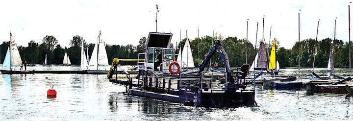 NATUR Schwimmende Mähmaschine schneidet das wuchernde Seegras. Segelschule am Unterbacher See lud zum Tag der offenen Tür. |