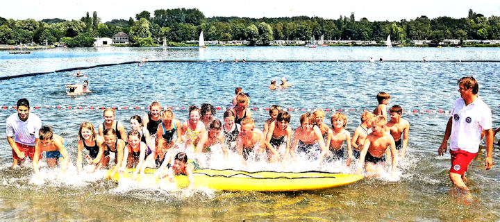 Eine tolle Abkühlung bietet der Unterbacher See an heißen Tagen. Aber: "Auch an Gewässern wie den Badestränden am Unterbacher See lauern Gefahren, die nicht unterschätzt werden dürfen", sagt Volker Kühnel, von der Düsseldorfer DRK-Wasserwacht. Diese hat gut zwei Dutzend Kinder aus NRW zu einem Juniorretter-Camp eingeladen, das am Samstag zu Ende gegangen ist. Dabei lernten die acht- bis Zwölfjährigen spielerisch, mit Gefahren im Wasser umzugehen. Sie dürfen sich nach absolvierter Prüfung nun "Juniorretter" nennen. |
