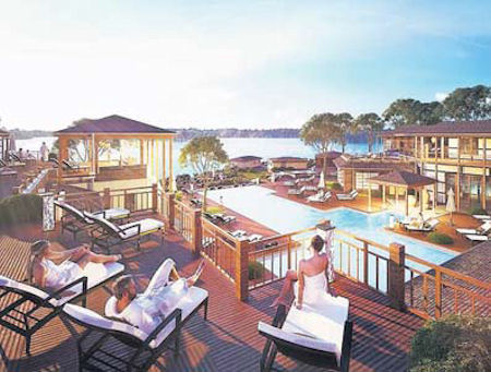 Bambusterrassen, niedrige Holzhäuser und Pools sollen an Bali erinnern. Auf die Stege im See verzichtete der Betreiber nach langem Gezerre. |