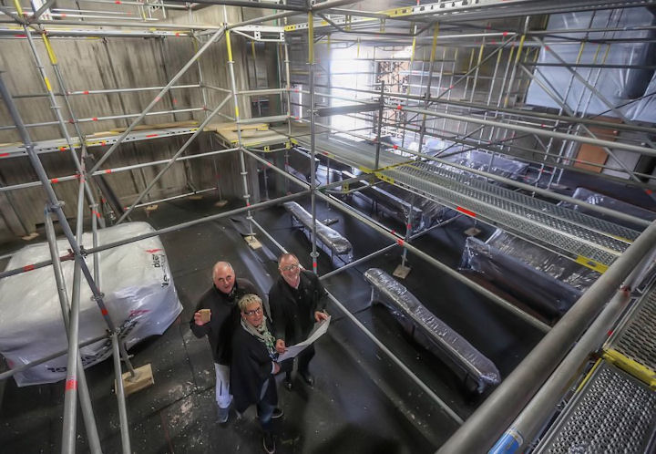 Hubert Martina (Pfarrgemeinderat), Architektin Sabina Sommer und Pfarrer Günther Ernst (v.l.) stehen inmitten des Baugerüstes, das bis zur Kuppel der Kirche hinauf reicht. |